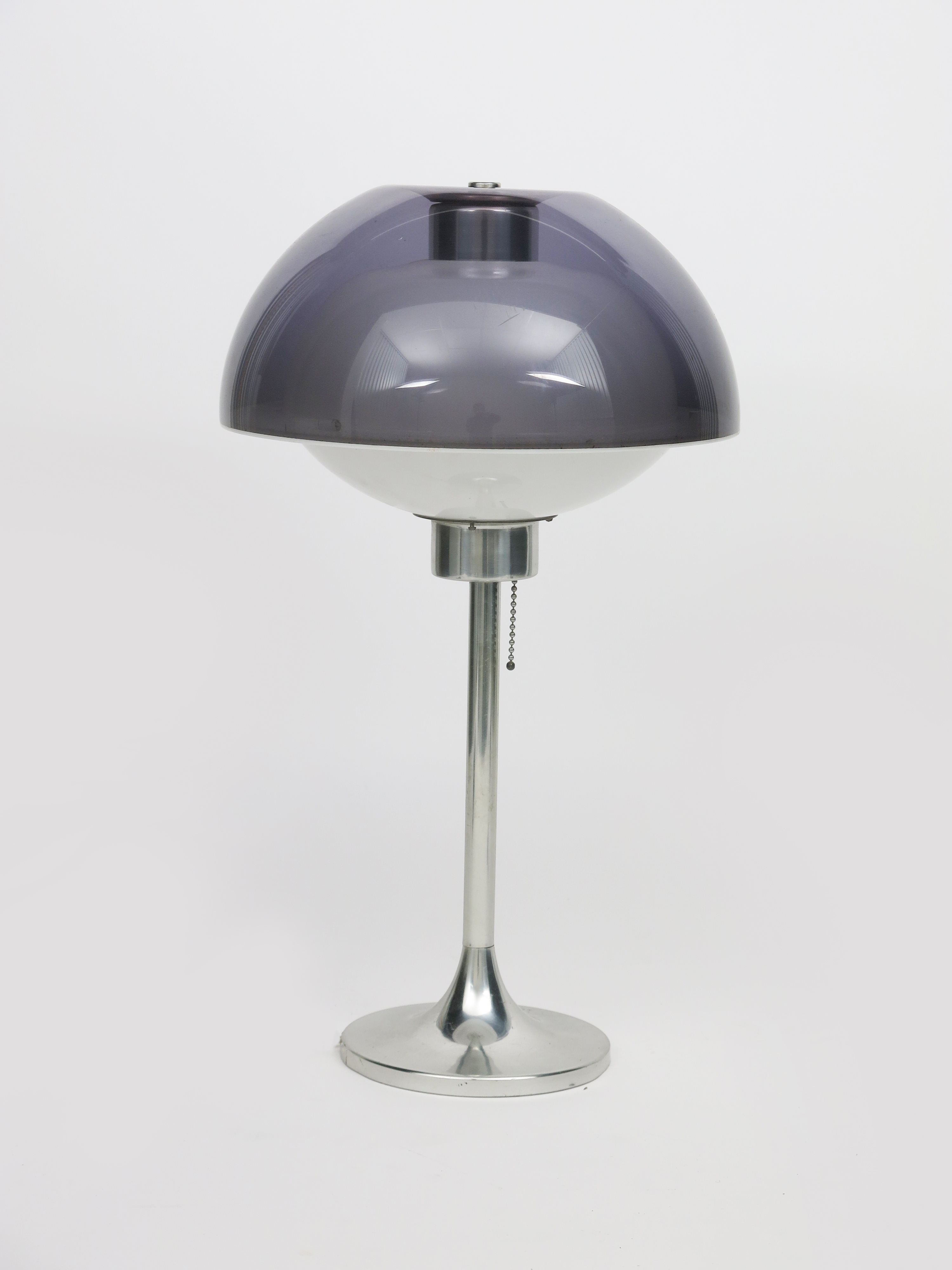 A Lumitron table lamp designed by Robert Welch, smoked blue and opaque perspex on polished aluminium stem, 53cm. high