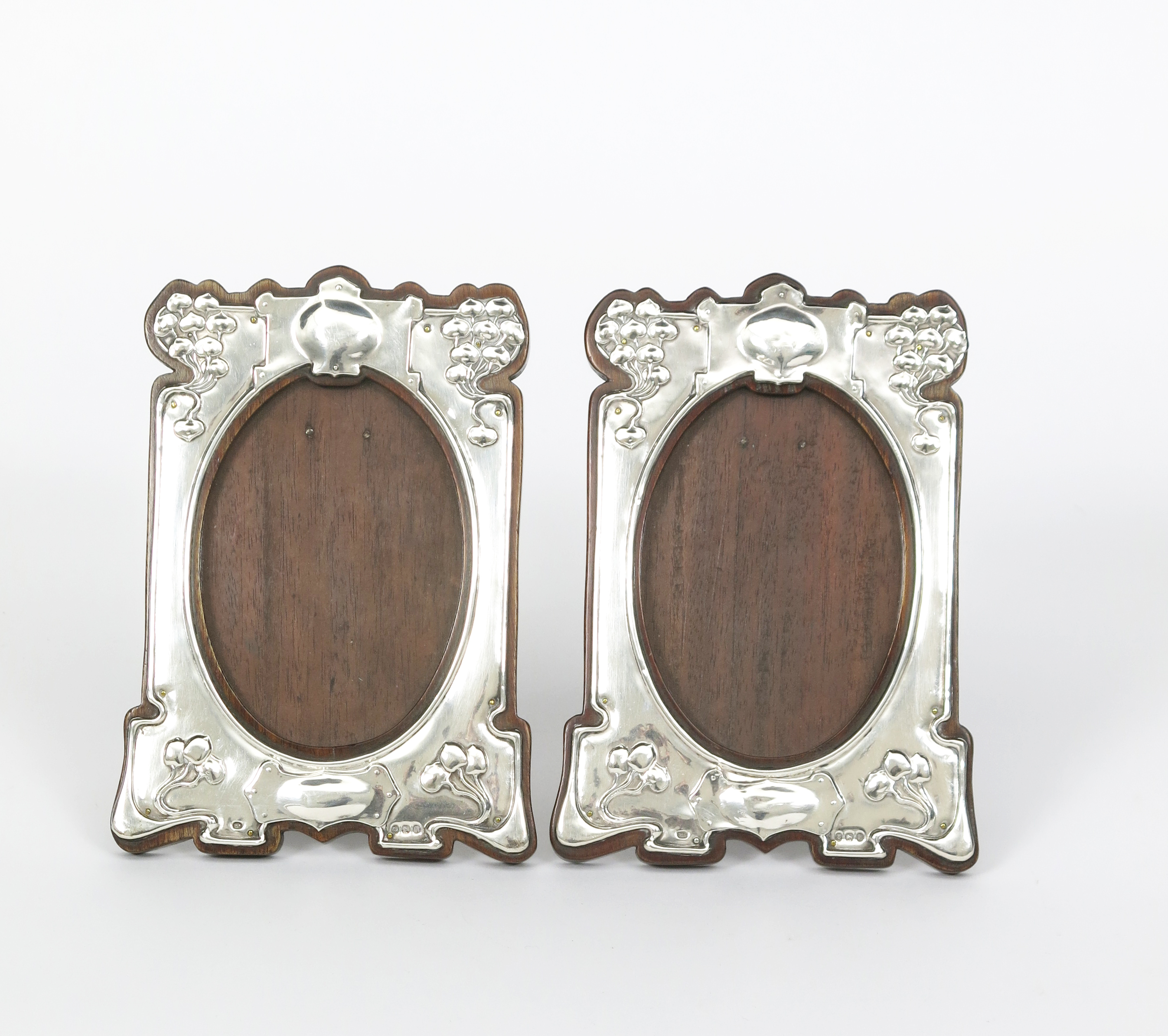 A pair of William Aitken silver photograph frames, shaped rectangular form on wooden mount and easel back support, stamped in low relief with Art Nouveau foliate panels, stamped marks, WA Birmingham 1907, 18cm. high, (2)
