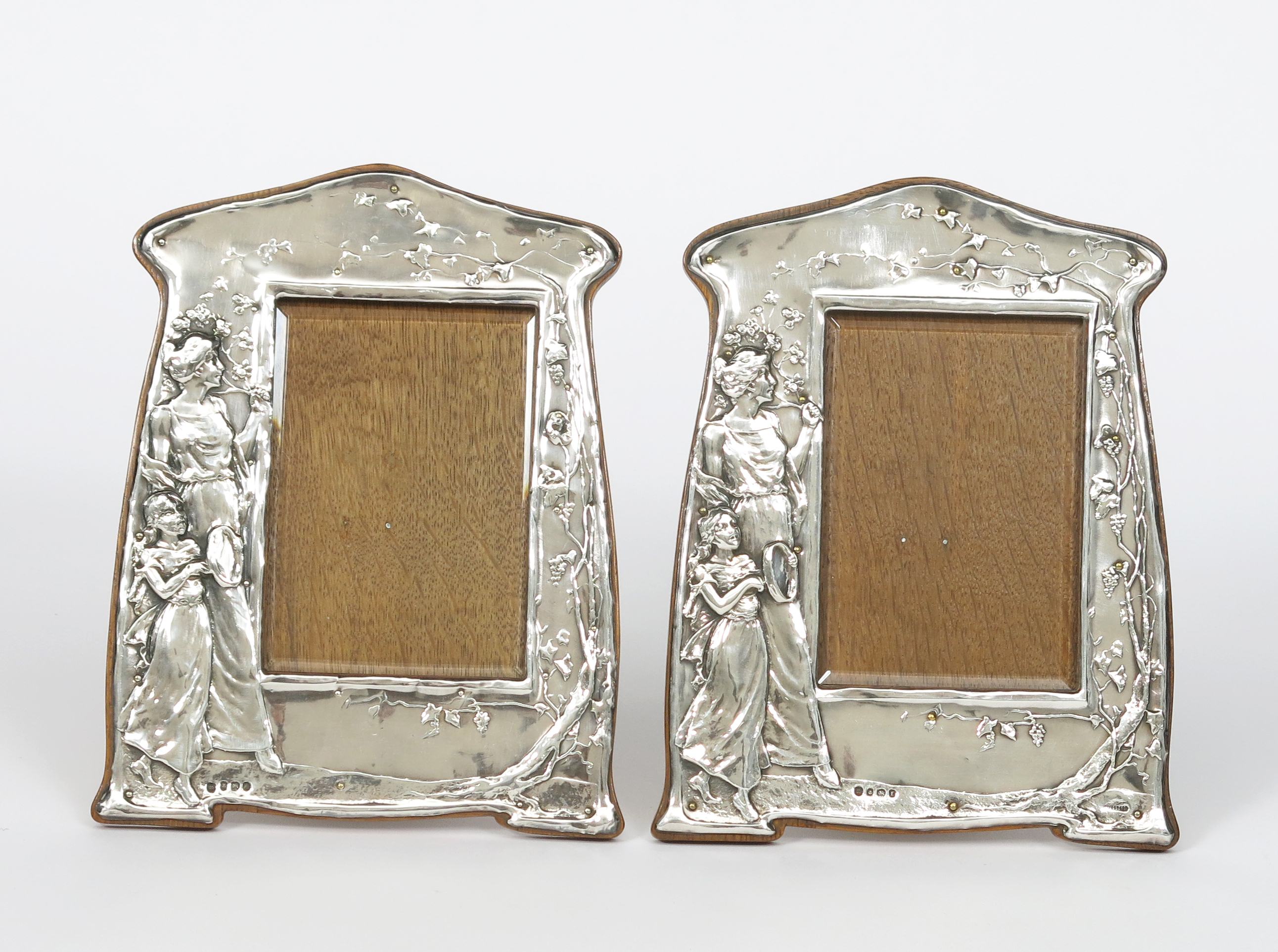 A pair of James Deakin silver photograph frames, on wooden back with easel support, stamped in low relief with a maiden and young girl walking amongst flower boughs, stamped marks, Birmingham 1905 and 1906, 25cm. high (2)