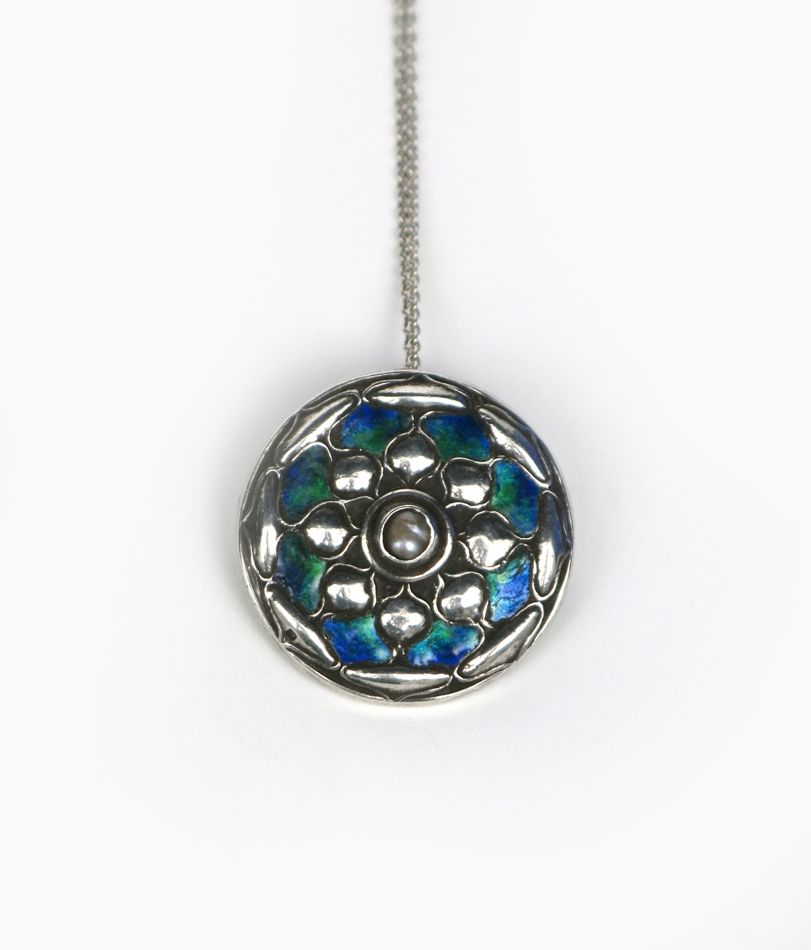 A William H Haseler silver and enamel button pendant necklace designed by Archibald Knox, retailed by Liberty & Co, circular with radiating peacock feather design, enamelled in blue and green, set with central blister pearl panel, with applied hanging loop and brooch pin to back, stamped WHH mark, Birmingham 1909, 3.2cm. diam.