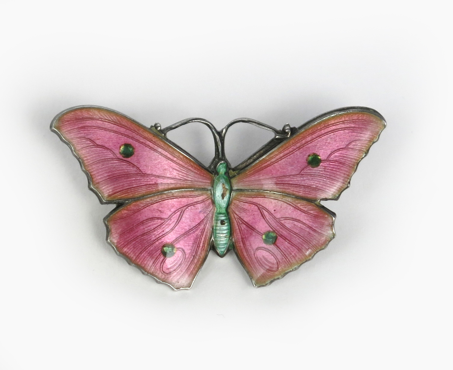 A John Atkins & Sons silver and enamel butterfly brooch, model no.1085, cast and enamelled in pink enamel with pale green detailing, cast marks JA & S and sterling silver to reverse, 3.5cm. wide