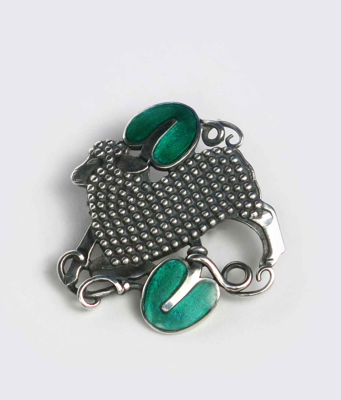 A Georg Jensen silver and enamel brooch designed by Arno Malinowski, model no.284, pierced and cast in low relief with a lamb before two enamelled green leaves stamped marks, 3cm. wide