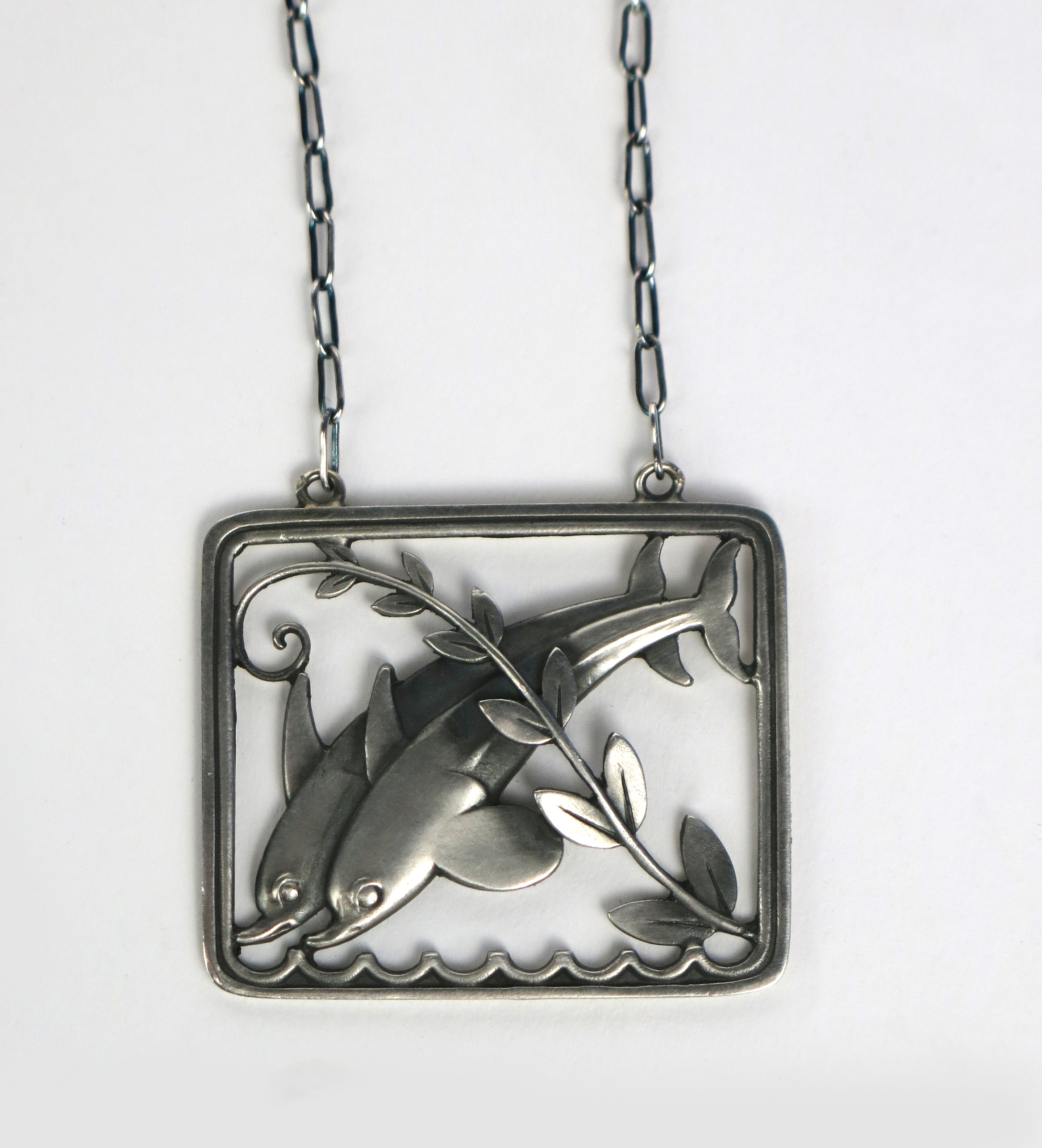 A Georg Jensen silver pendant necklace designed by Arno Malinowski, model no.94, rectangular, pierced and cast with two dolphins leaping above stylised waves, behind a leaf frond, on link chain, stamped marks, 3.5cm. wide.