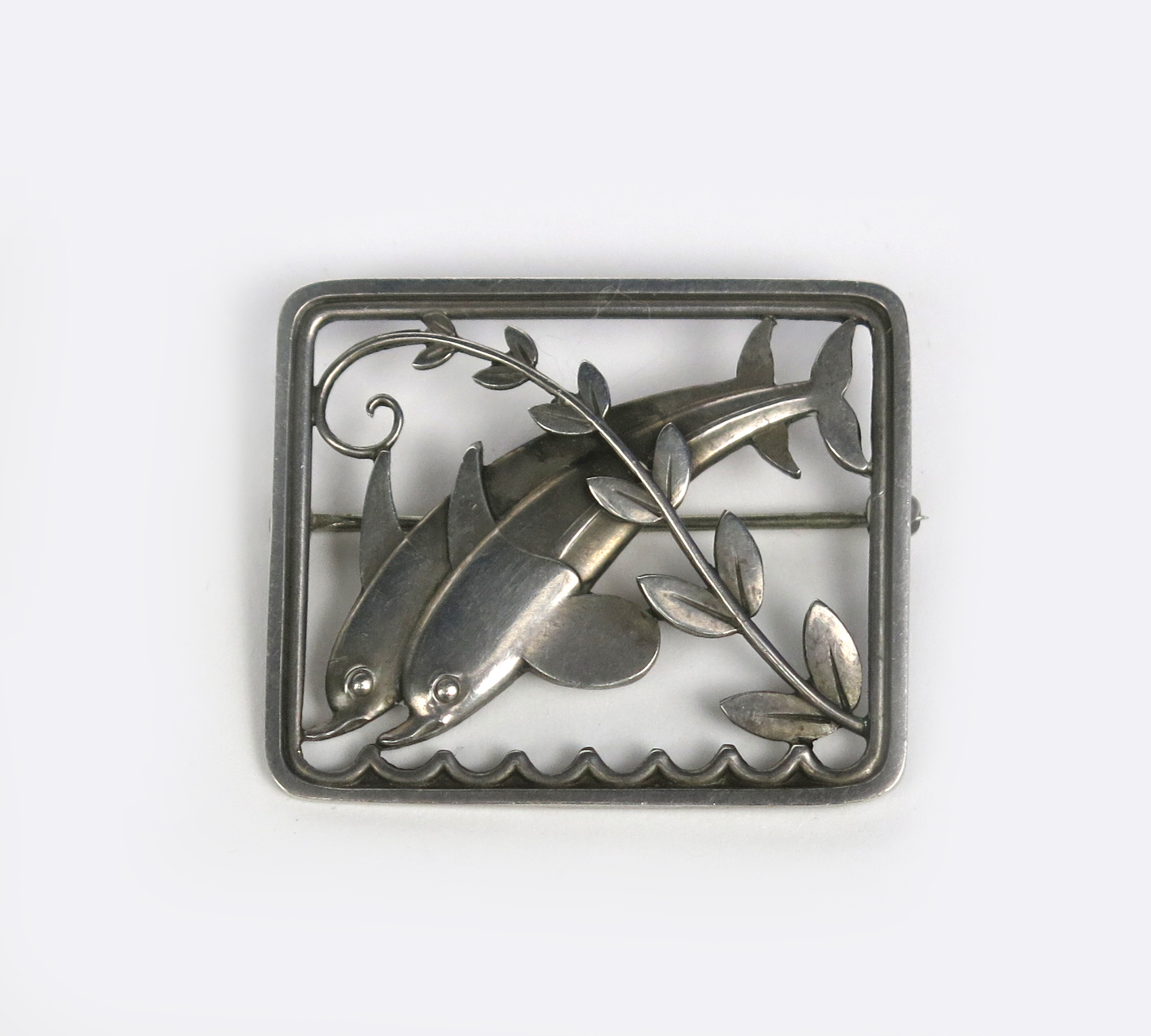 A George Jensen silver brooch designed by Arno Malinowski, model no. 251, rectangular, pierced and cast with two dolphins leaping above stylised waves, with foliate frond stamped marks, 3.5cm. wide
