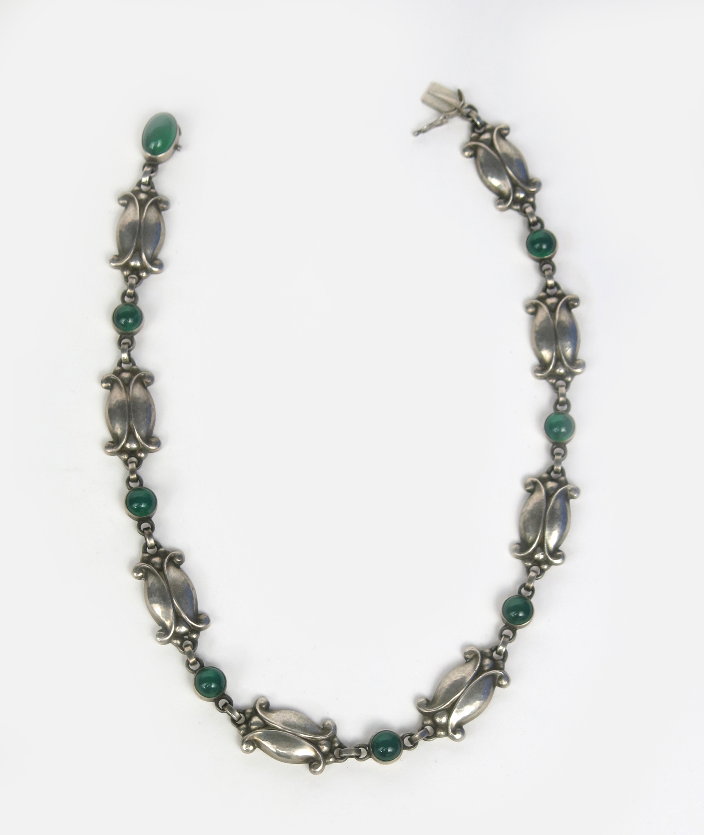 A Georg Jensen silver and chrysoprase Seed and Pod necklace designed by Georg Jensen, model no.15, alternate silver foliate panels and chrysoprase roundels, with box clasp and safety catch stamped marks, 38cm. long