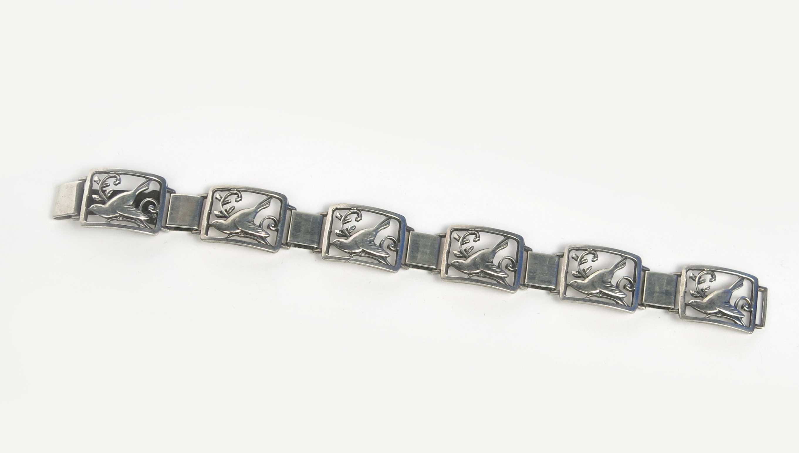 A Scandinavian silver link bracelet, probably by Carl Brumberg Hansen, Denmark, six pierced rectangular panels cast with a bird flying past scrolling foliage stamped CBH 830 S, 18.5cm. wide