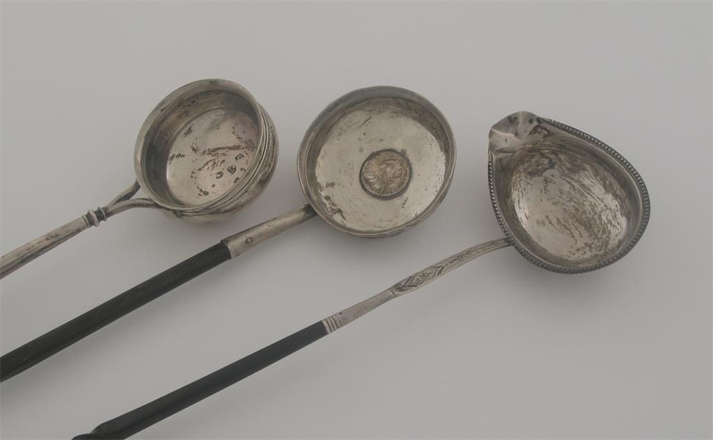 Three punch ladles: a George III Scottish provincial example with a twisted whalebone handle and a coin inset bowl, initialled "D E Mc", by John Hogg, Perth (IH, eagle) c.1815, another with a bright-cut stema and a beaded rim, initialled "EM", marks rubbed, London 1788 and a George II example with a turned wooden handle and a circular bowl, by James Slater, London 1737. (3)