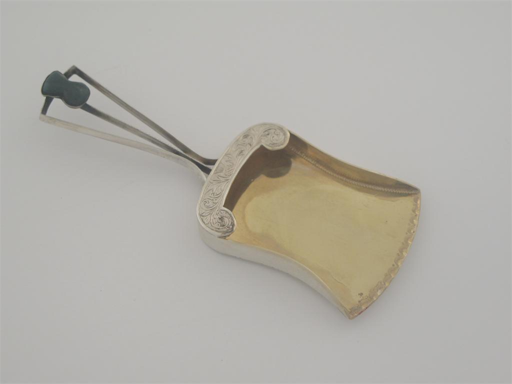 A modern 'Scottish Market' caddy spoon, in the form of a dustpan with an enamelled thistle terminal, gilt bowl and engraved thistles around the lip, by J. Gloster, Birmingham 1922.