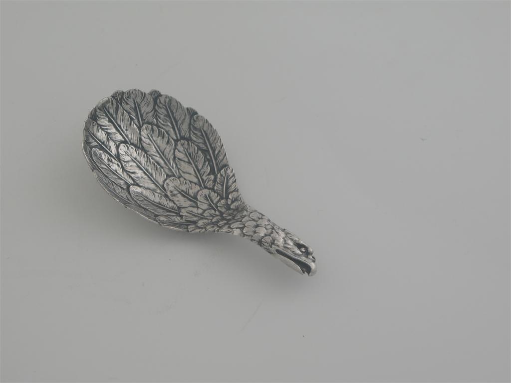A George III eagle's wing caddy spoon, with realistically textured plumage, by Joseph Wilmore, Birmingham 1814.