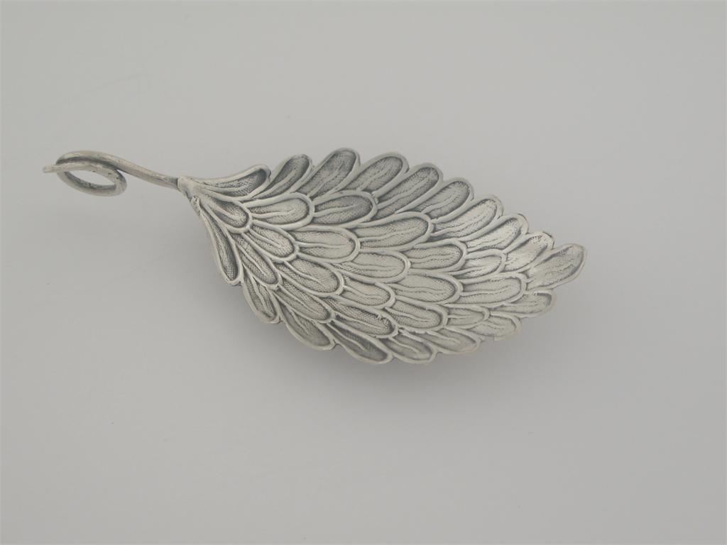 A George III caddy spoon, with a tendril handle, the bowl stamped to simulate plumage, maker's mark only, by Samuel Pemberton, Birmingham c.1800.