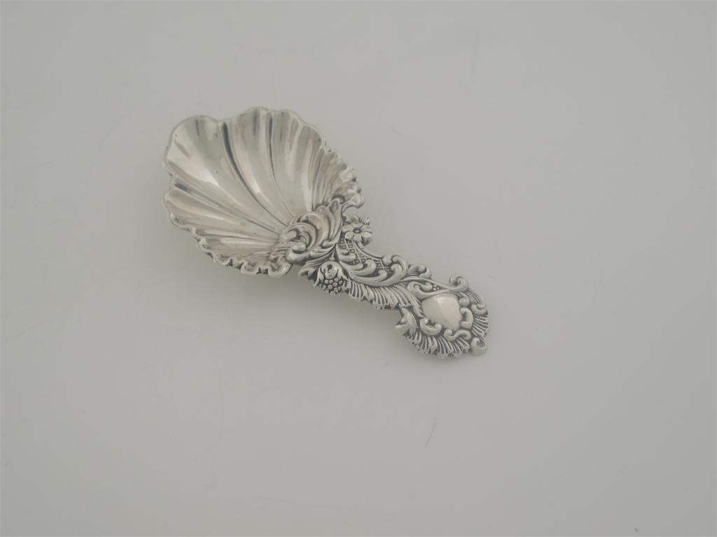 A Victorian 'stamped' caddy spoon, with a shell bowl and scrollwork stem, by Aaron Hadfield, Sheffield 1851.