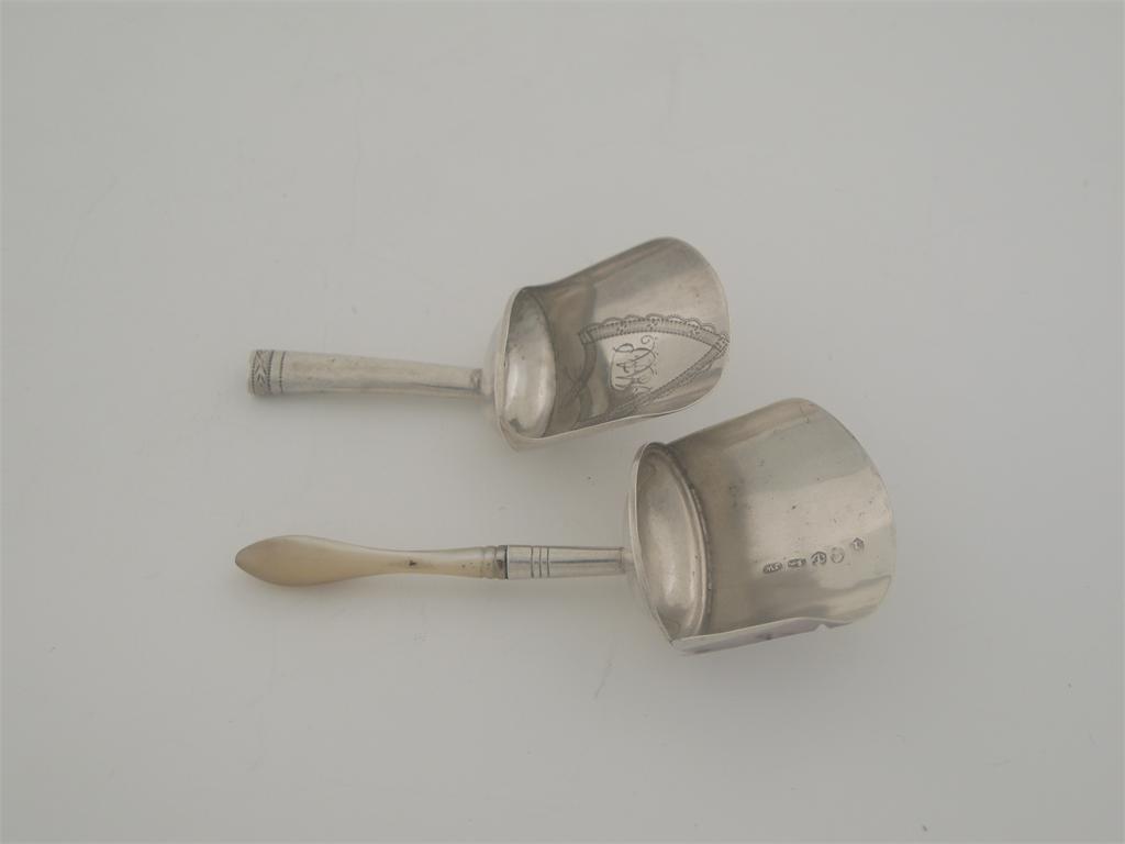 Two George III caddy shovels: Joseph Wilmore 1806, and Joseph Taylor, 1802 (2).