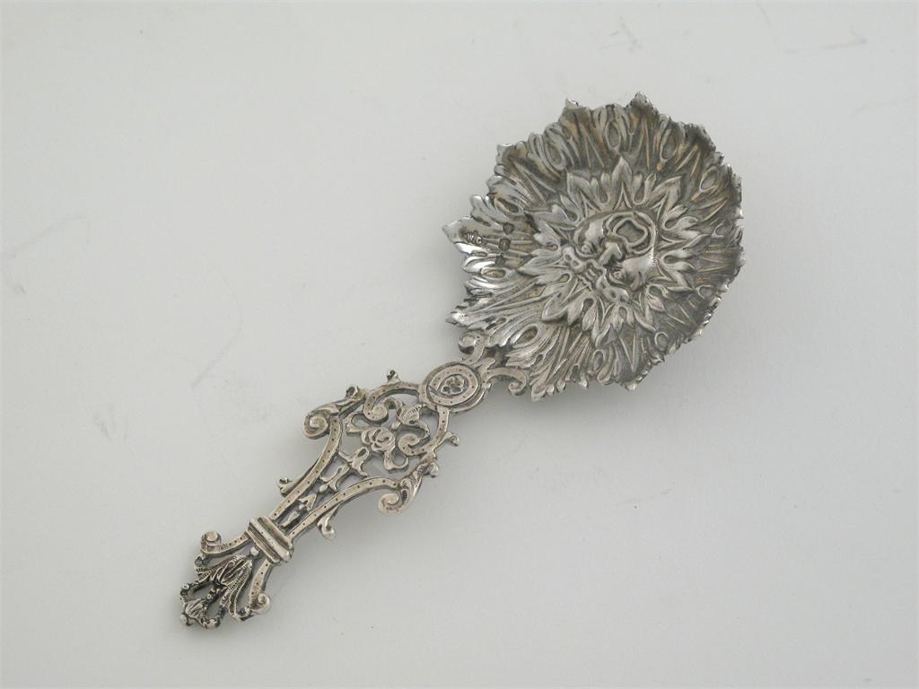 A late Victorian caddy spoon, with an openwork 'lyre'-shaped handle, the bowl in the form of a sun mask, by William Comyns, London 1890.