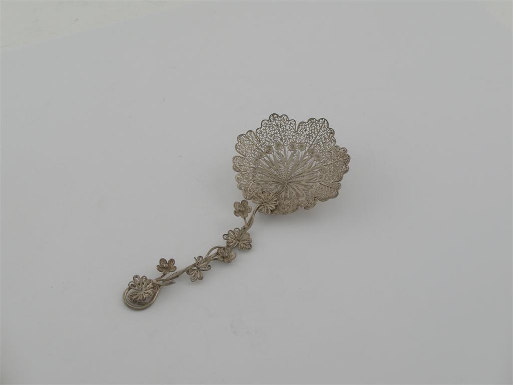 An early 19th century filigree caddy spoon, the tendril stem with applied florets, unmarked, 5in (12.5cm) long.