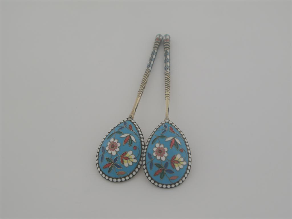 A pair of late 19th/early 20th century Russian silvergilt and polychrome enamel, lemon teaspoons, with floral decoration on the back of the bowls, maker "HA" with state marks for 1896-1908. (2)