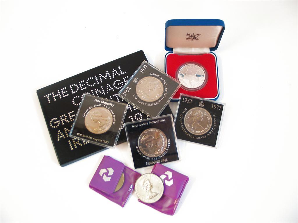 Elizabeth II, Maundy set, 1971, in case; George V, Halfcrown, 1935, in card presentation box, these extremely fine; Guernsey, proof sets (2) 1971, 1985; various proof crowns (4), sets (2) and sundry cased crowns and Guernsey 10-Shillings, etc. (lot)
