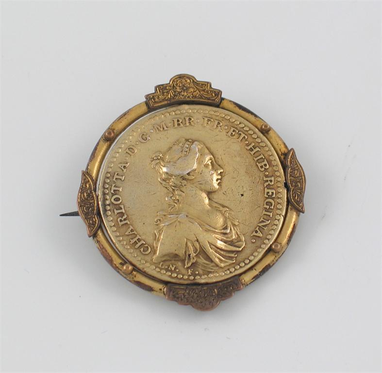 Queen Charlotte (1744-1818), her official silver Coronation Medal, by Johann Lorenz Natter,bust right, rev Fame crowns the Queen, 34mm (BHM 66), only 400 specimens struck in silver. Gilt and mounted as a decorative brooch.