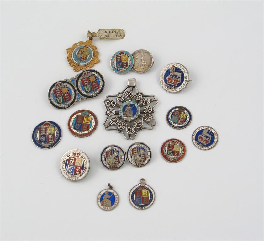 A group of enamelled coins (14), George III, double-sixpence brooch; Victoria, double-shilling and double-sixpence brooches; 'Lion' Shilling and Sixpence and Britannia Groat, blue and white; Victoria, Shilling and Sixpence pairs, red, white and blue borders; others (2). with brooch and other mounts. All enamel in excellent condition. (14)