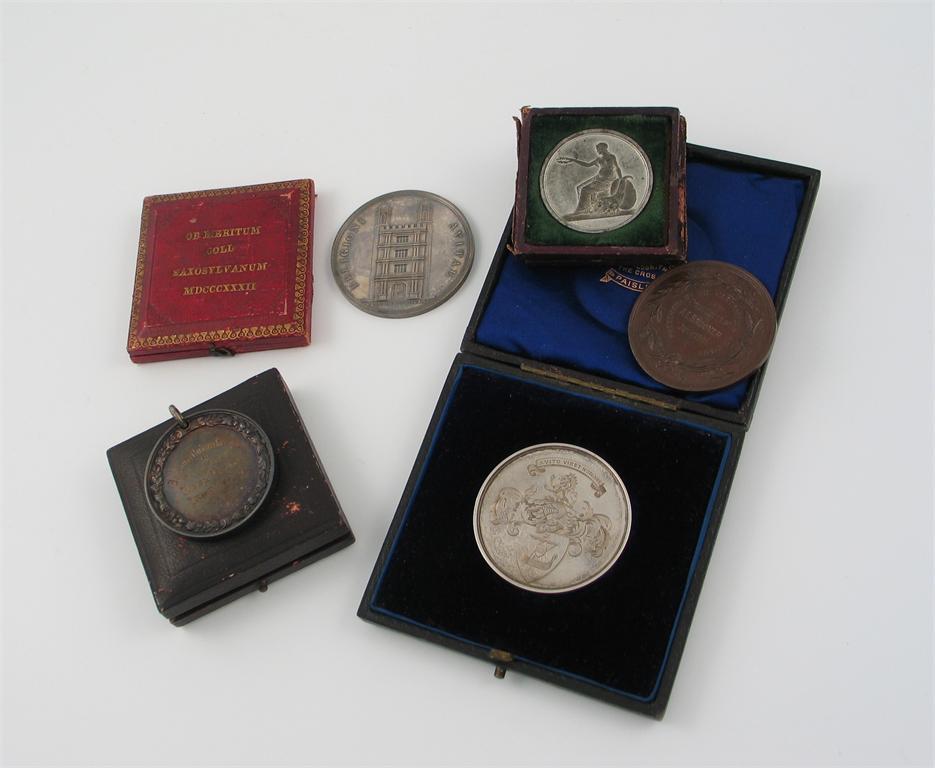 Educational Prize Medals, Stonyhurst College, silver prize medal, issued in 1832, by T. Halliday, the tower entrance, rev legend, 43mm, in case of issue; other educational medals, Renfrew, County Scholarships 1900, silver medal (Edward Stuart Russell), engraved armorial design, 49mm, in case; Bognor Regis School, Regular Attendance 1901, silver (Rose Tadd), 44mm, in case; Carpenters' Company, King's College 1900, copper medal (A. E. Brooker), 48mm; and a cased white metal medal, 1867, 38mm, in case. Mostly extremely fine, first choice and rare. (5)