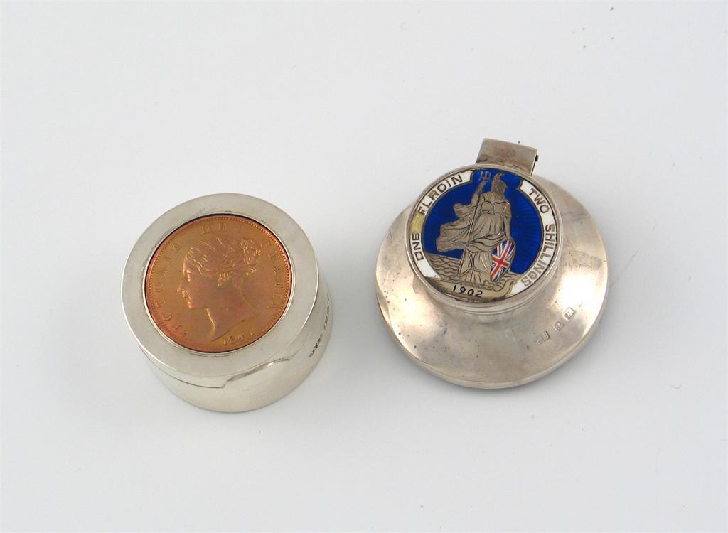 A small silver inkwell, the hinged lid inset with the enamelled reverse of a Florin, 1902, standing Britannia, the base tortoiseshell, Birmingham Hallmark (date letter and maker unclear), stands 1 inch high. Slight damage to white enamel between ONE and FLORIN, a nice Edwardian coin-related item; circular silver 'coin' box, lid and base set with Victorian Halfpenny and Edward VII Penny respectively, maker AB & S, Chester 1902.