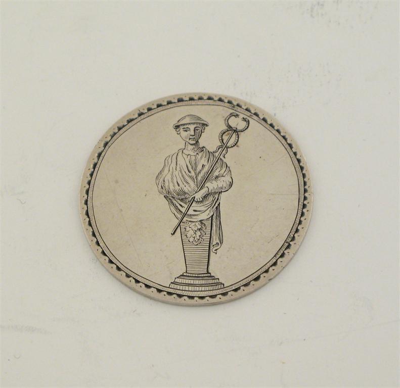 A George III bright-cut circular medal, with a curious demi figure an one side, inscribed "SERMONE LATINO DOCTISSIMO D.D", by George Lowe (of Chester), c.1800 (no date letter), 1.7in (4.3cm) diameter.