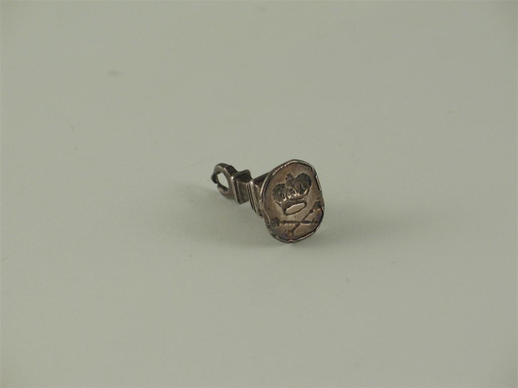 A fob seal with a baluster stem, canted oblong matrix and intaglio " Royal crown and crossed maces", perhaps military significance, 18th century, 1in (2.6cm) high.