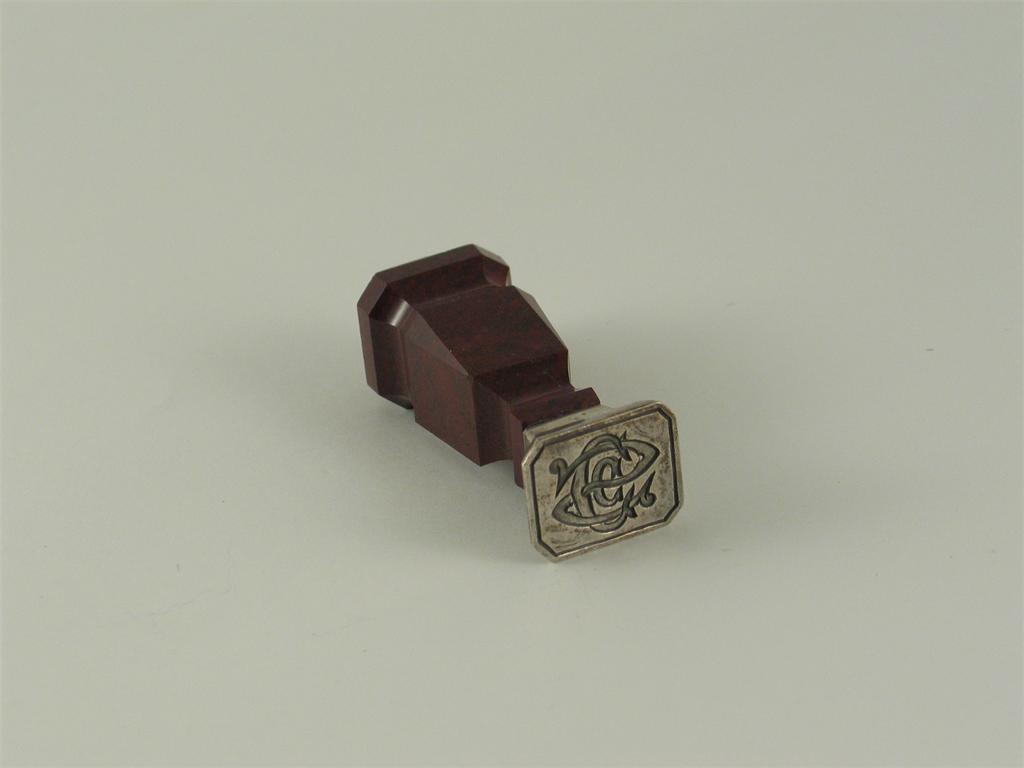 A Victorian mounted red hardstone desk seal, of faceted form, double-ended with an intaglio monogram and a crest and motto, 2.5in (6.6cm) high.