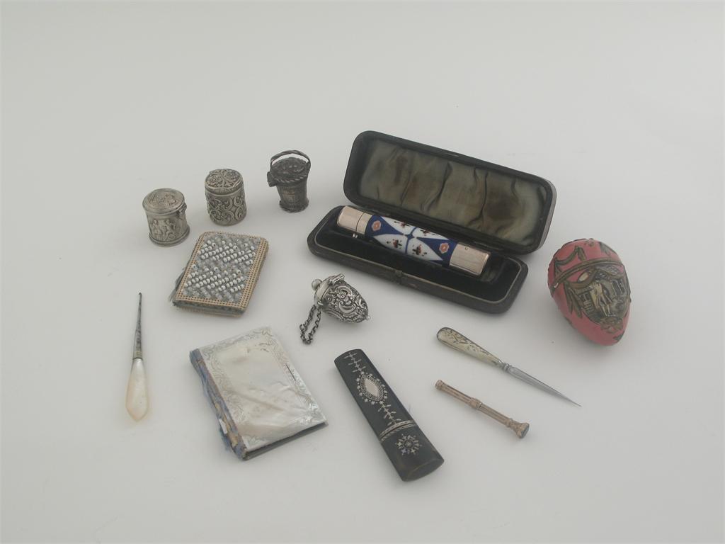 Miscellanea: a Dutch thimble 'basket', a late Victorian thimble case with embossing, an inlaid tortoiseshell needle case, two small boxes, two piercers (with steel points), a mounted porcelain scent tube (in a case) a mother of pearl needle case, a beadwork needle case, a gilt metal telescopic pencil and a papier mache, painted egg box "a present from the Bath". (12)