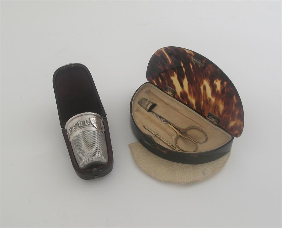 A modern mounted tortoiseshell sewing etui, of demi-lune outline containing only a thimble, gilt metal scissors and a bodkin, together with a "thimblefull" tot beaker, initialled "ST" by George Unite, Birmingham 1885 (in a fitted case), the later 2.25in (5.5cm) high. (2)