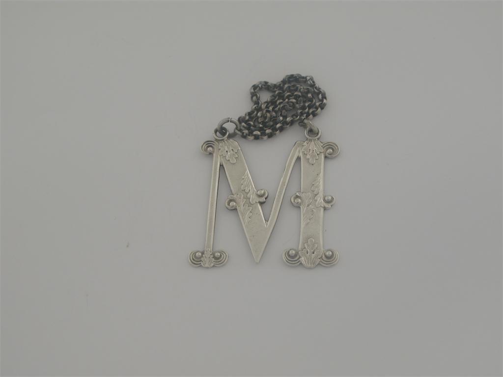 A George IV wine label, in the form of a letter "M" with scroll adornment, maker's mark "GMH" (possibly for George McHattie of Edinburgh - overstriking another), Birmingham 1828.