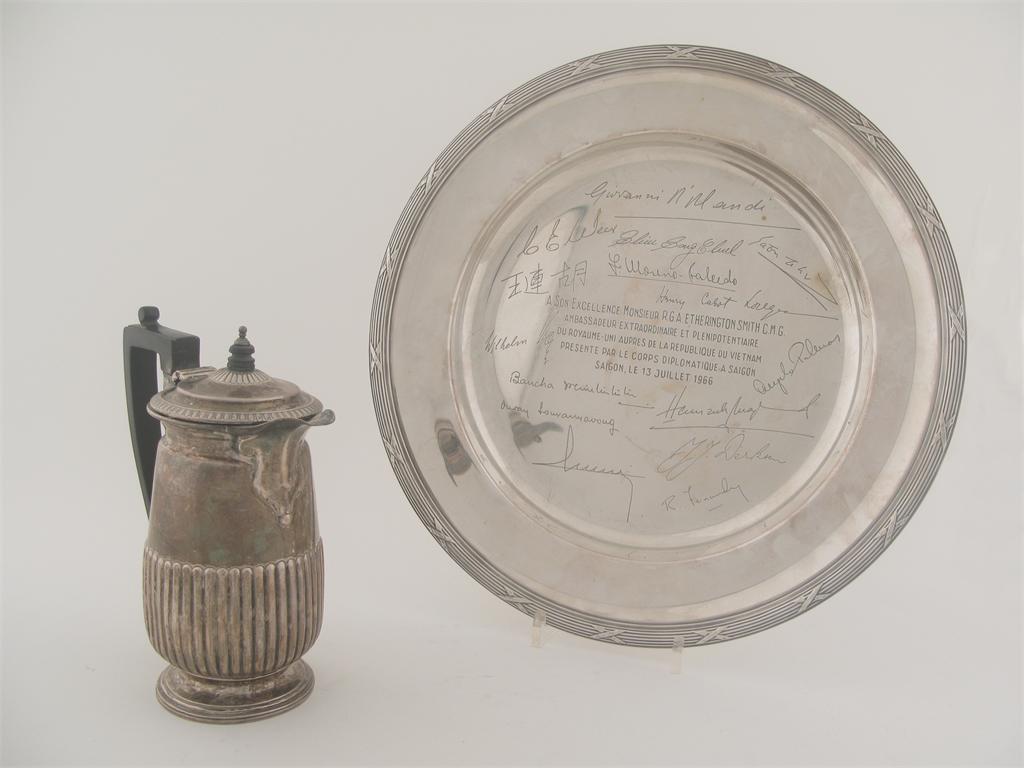 A small late Victorian part fluted hot water jug, by W & G Sissons, London 1896, and a French plated dish with inscription and facsimile signatures, by Christofle, the jug 7.1in (18cm) high, 12oz weighable silver. (2)