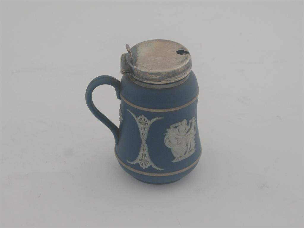 An Edwardian mounted Wedgwood jasperware mustard pot, maker "BDW", Birmingham 1904, 3.2in (8cm) high.