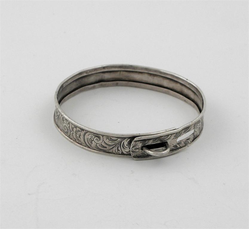 An early Victorian, small engraved dog collar, with an adjustable clasp, and a cartouche on one side, inscribed with the name of the dog "Boz" and the owner "Mrs Hoare", unmarked c.1840, 2.75in (7cm) diameter - at its largest, 0.5oz.