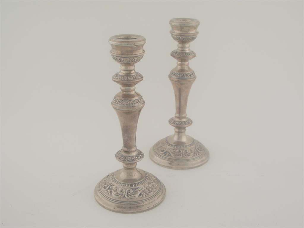 A pair of modern candlesticks, with round bases and embossed decoration (loaded), 8.9in (22.5cm) high. (2)