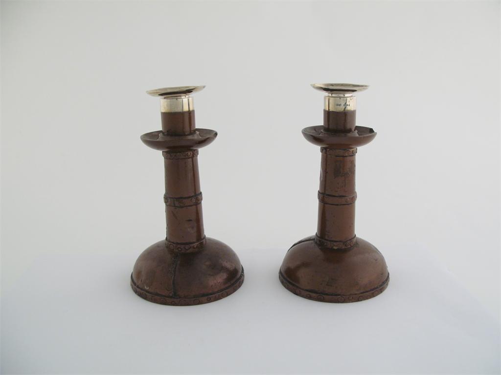 A pair of unusual, late Victorian arts & crafts candlesticks, mounted "Doulton Lambeth Silicon" pottery imitating rivetted copper with domed bases and drip pans, maker Henry Titterton Brockwell, London 1892, 7.2in (18cm) high. (2)