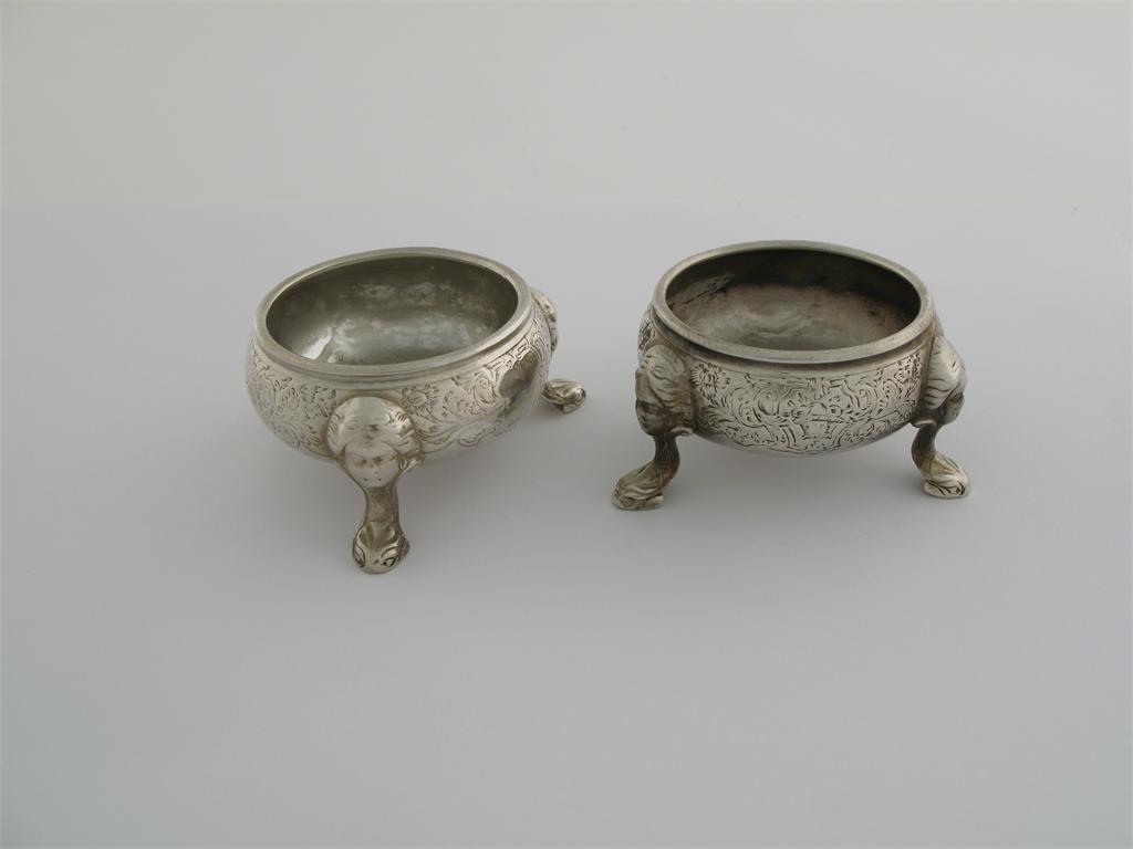 A pair of George II squat circular salts, on three mask and shell feet with flat-chasing in between, by an unidentified maker "IW"?, London c. 1735, marks worn, 4oz (2).