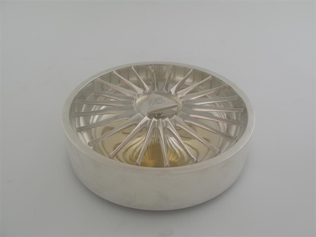 A modern squat circular rosebowl, with plain vertical sides and a removable grille resembling a stylised sunburst, the centre initialled, the base inscribed "Designed for Roger and Frances Beale, by Alex Styles and made by Garrard", by Garrard & Co, London 1969, 7.8in (20cm) diameter, 41.5oz.