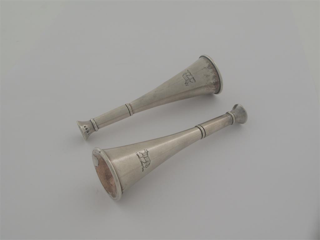 Ensuite to the preceeding lot: Hunting Interest: a pair of late Victorian novelty pepperettes, in the form of hunting horns, crested, by Joseph Braham, London 1887, 4.75in (12cm) high, 2.75oz. (2)