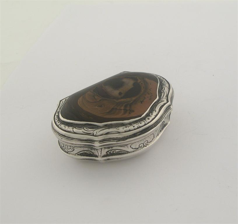 A George II cartouche-shaped snuff box, with chased decoration and an agate-set cover, gilt interior, maker's mark only, by Robert Cox, London c.1740, 2.75in (7cm) wide.