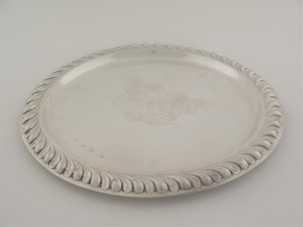 A James II circular stand, with a moulded, swirl fluted border, the centre engraved with a large coat of arms within plumed mantling, maker's mark "IC" mullet below* London 1687 (lacking foot), 13.75" (35cm) diameter, 27oz.