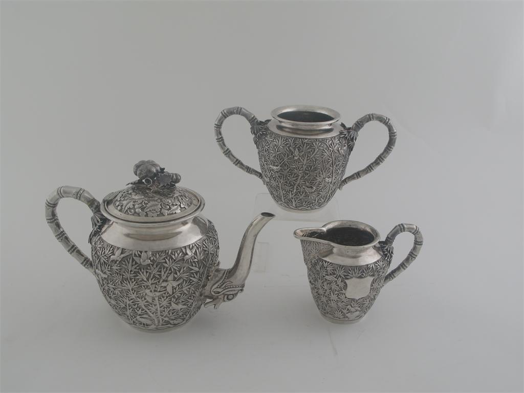 An early 20th century Chinese Export, three piece teaset, with simulated bamboo handles, the bodies profusely decorated with finches amongst bamboo, centred by vacant shield cartouches, the teapot with fruit finial, by Wang Hing & Co, 1900-1920, 34oz. (3)