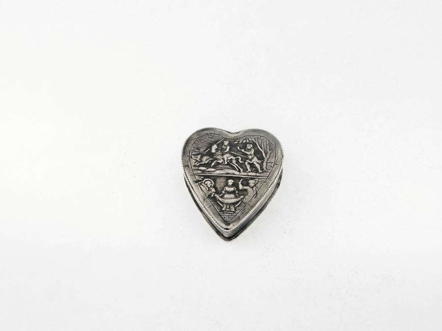A curious 18th century heart-shaped box and cover, stamped with a pig-sticking scene above a sacrificial? meeting, maker's mark a horse, town mark a turret above an "x", unascribed, probably Spanish, 2in (5.1cm) long, 0.75oz.