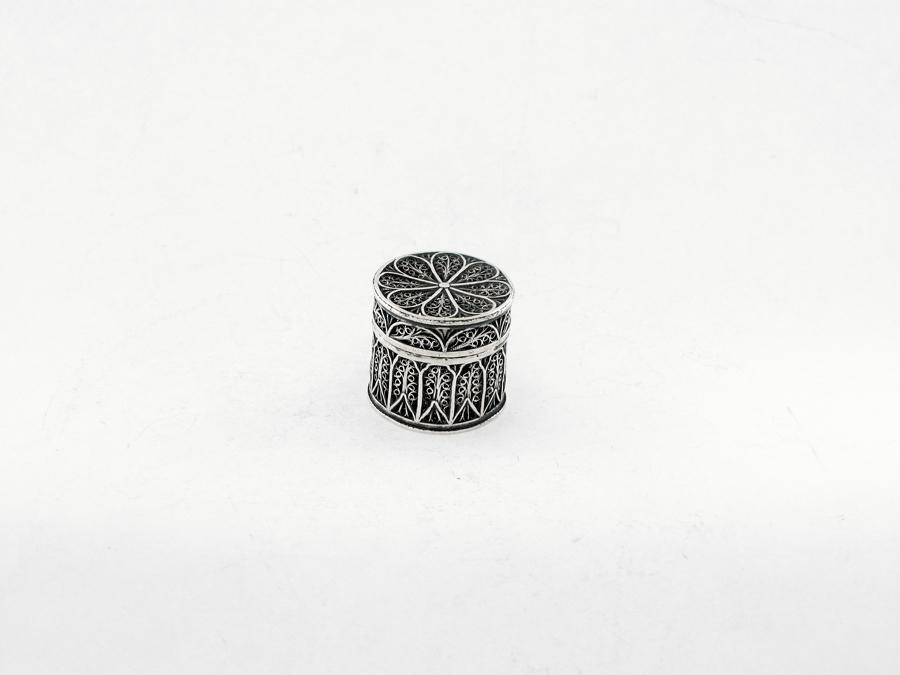 A filigree work counter box and cover, probably early 18th century, unmarked, 1.1in (2.6cm) diameter.