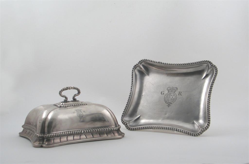 Royal Association. a set of four early George III entree dishes with cushion-domed covers, incurved corners and gadrooned borders, the covers and dishes engraved with the Arms of King George III, the undersides of the dishes engraved with the Arms of King George III, the undersides of the dishes engraved with an Earl's crest and coronet * and scratchweights and numbers, by Peter Archambo (II) & Peter Meure, London 1763, 10.3in (26.2cm) wide, 205oz. (4)