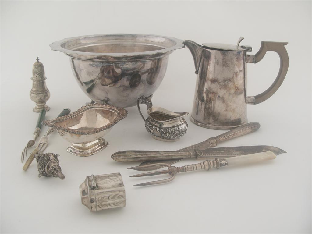 A mixed lot: two similar bon bon dishes, by William Comyns, two cream jugs, a sauce boat, a sugar bowl, four pepperettes, a mounted glass jar, a mounted glass dish (A/F), an engraved mustard pot (glass liner), a continental beaker, a pair of George II sugar nips, an egg cup (cased), a rattle, a pair of continental grape shears, a Dutch spoon, a cased set of six teaspoons and a pair of sugar tongs, a Dutch peppermint box, and two green stained ivory handled dessert forks, mixed maker's and dates, a gold telescopic dip pen and pencil (combined) and the following plated ware: four salts, a dish on four feet, a hot milk jug, two table lighters, and a quantity of flatware and cutlery, 33oz weighable silver. (lot)