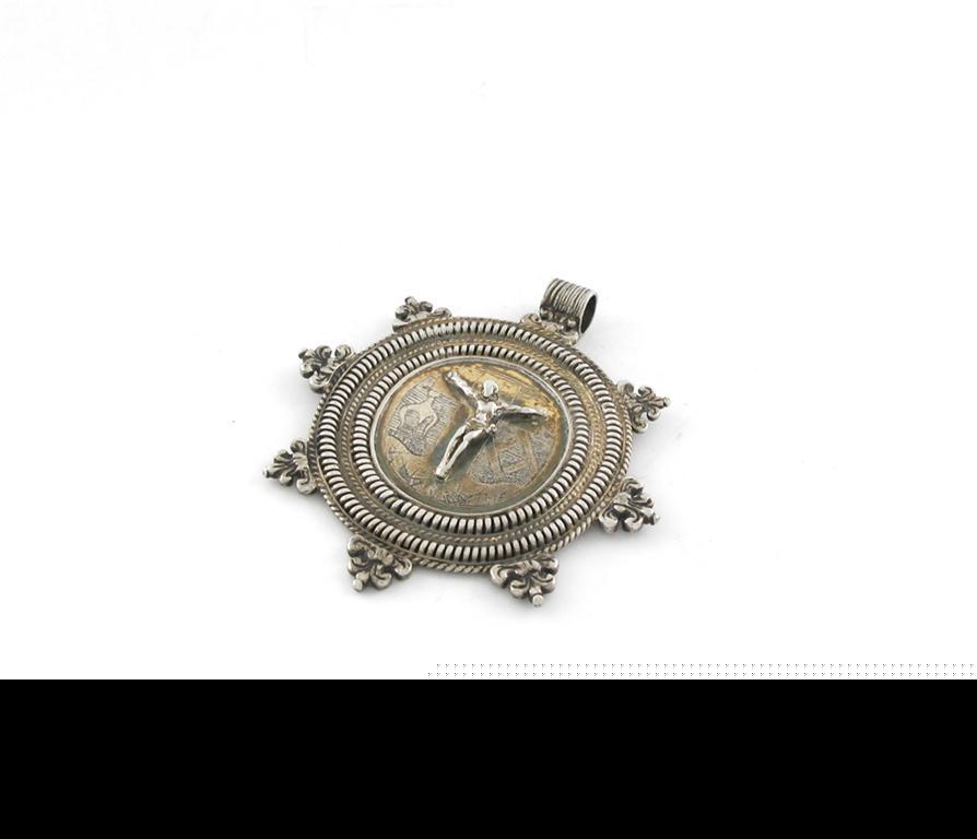 A 17th century continental parcel gilt oval crucifix pendant, with fleur de lys applied around the border, unmarked, 3.8in (9.7cm) high, 2.5oz.