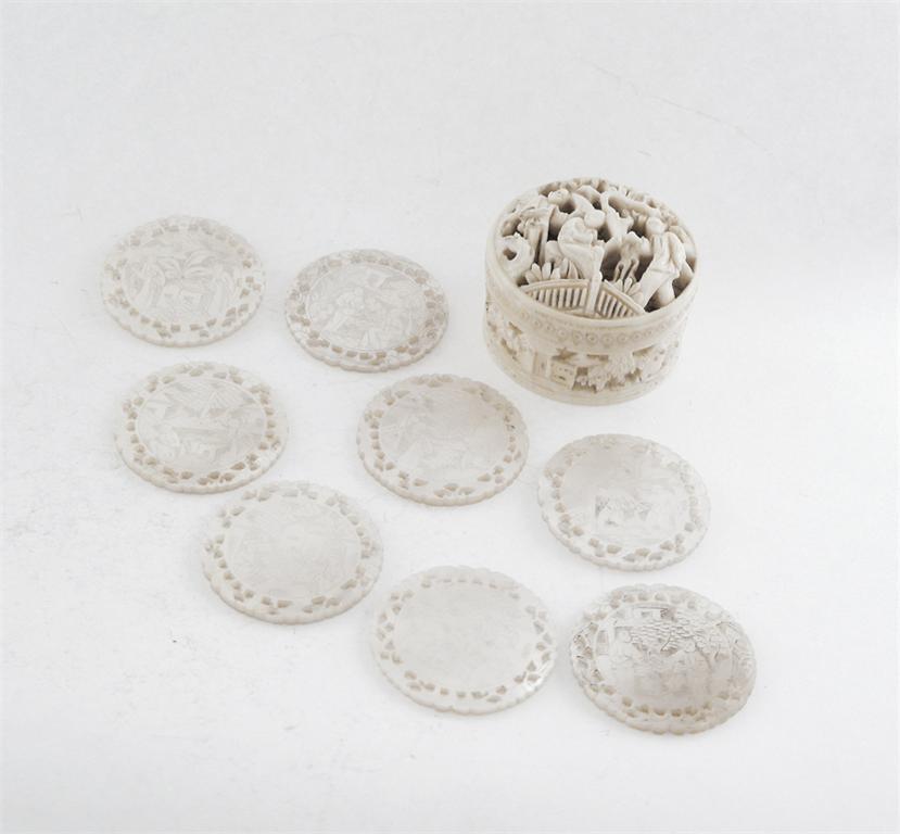 A 19th century Chinese carved ivory counter box, with a screw cover and eight carved mother of pearl counters with engraved decoration, 1.5in (3.8cm) diameter.