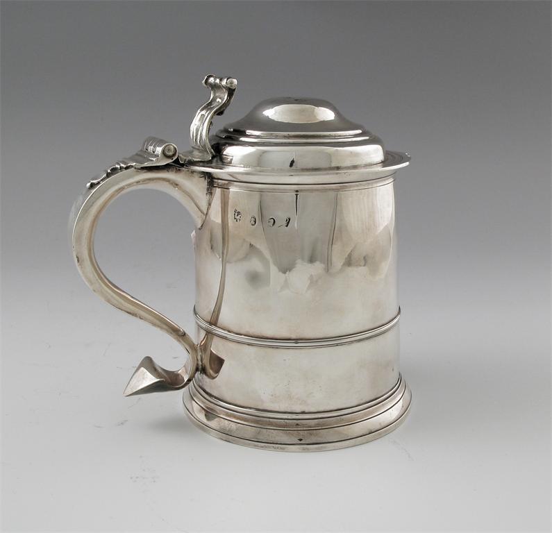 A Queen Anne tankard, of tapering form with a skirted base, domed cover with a broad brim; shaped at the front and a large scroll handle with a scroll thumbpiece, by Nathaniel Lock, London 1711, 7.1in (18cm) high, 23.5oz.