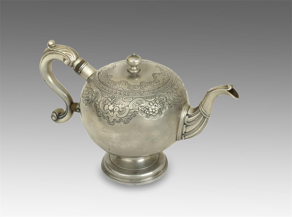 A good, George II Scottish 'bullet' teapot, on a domed circular pedestal foot with a leaf-capped, s-scroll handle, part fluted spout and a ball finial, the hinge and cover outline concealed by a mantle of chased decoration around the upper body, assay master Edward Lothian, maker's mark "IM" [with a figure in between] possibly for John Main, Edinburgh 1742, 23.25oz.