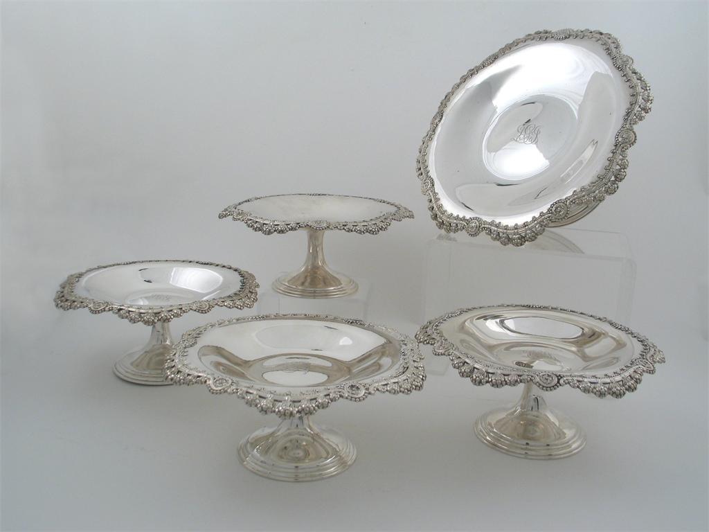 By Tiffany & Co: an American suite of four small and one large tazzae on spreading pedestals with cast borders of bunches of cherries, pierced and interspersed with floral roundels, script initials, c.1900, the larger tazza, 11.6in (29.5cm) diameter, 103oz.